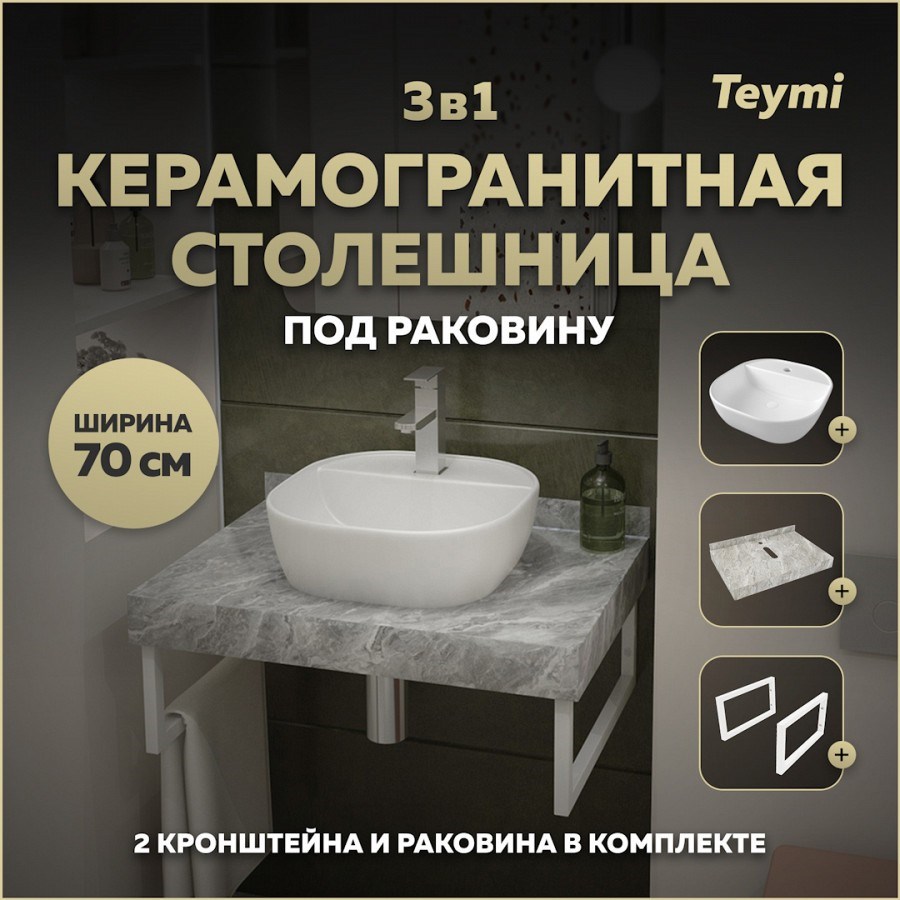 Столешница керамогранитная 70 см серый мрамор с раковиной Teymi Solli 40 кронштейны 2 шт. белые в комплекте F14118
