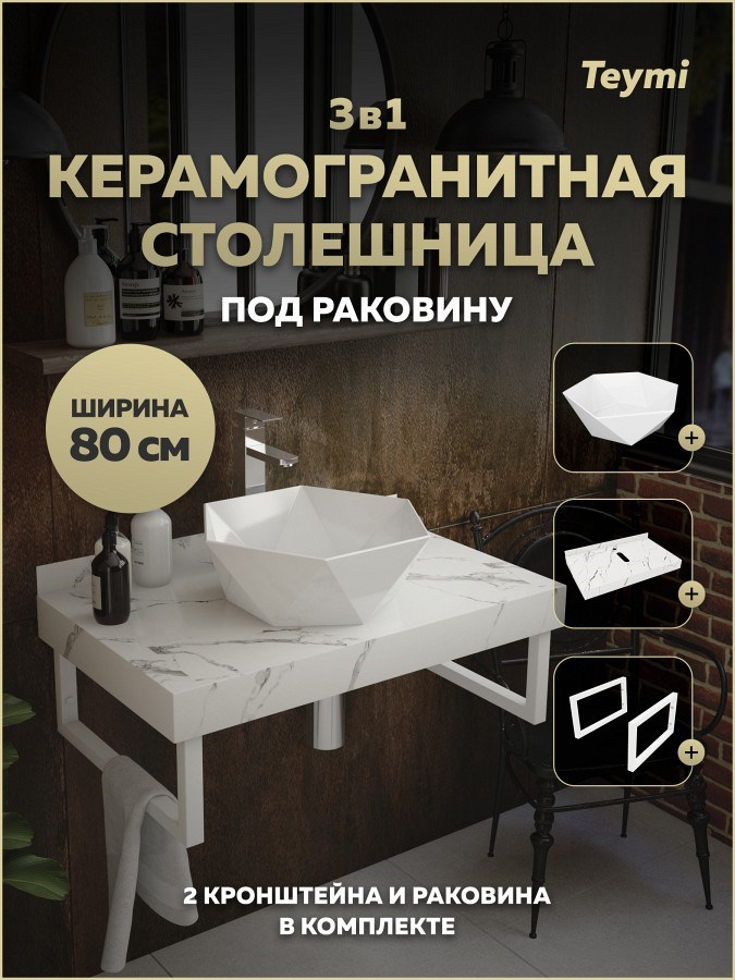 Столешница керамогранитная 80 см белый мрамор с раковиной Teymi Diamond 48 кронштейны 2 шт. белые в комплекте F15388