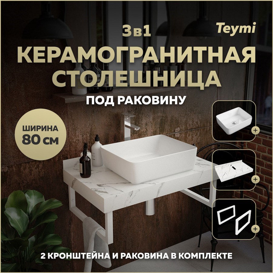 Столешница керамогранитная 80 см белый мрамор с раковиной Teymi Helmi 50 кронштейны 2 шт. белые в комплекте F14006