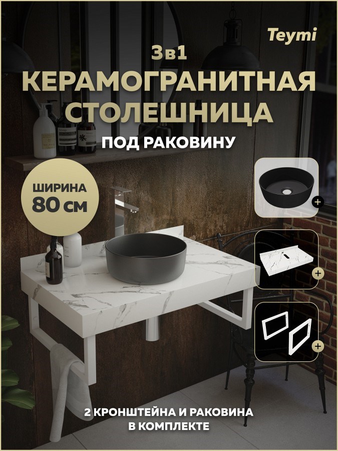 Столешница керамогранитная 80 см белый мрамор с раковиной Teymi Lina D31 черная матовая кронштейны 2 шт. белые в комплекте F15528