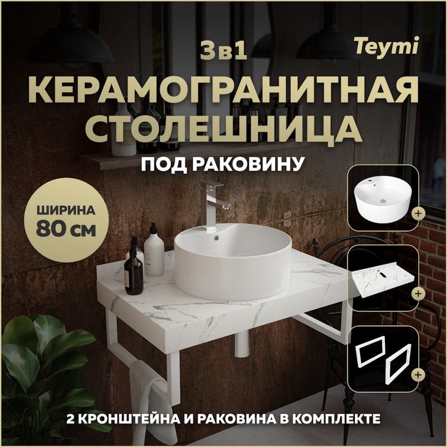 Столешница керамогранитная 80 см белый мрамор с раковиной Teymi Lina Pro D40 кронштейны 2 шт. белые в комплекте F14022