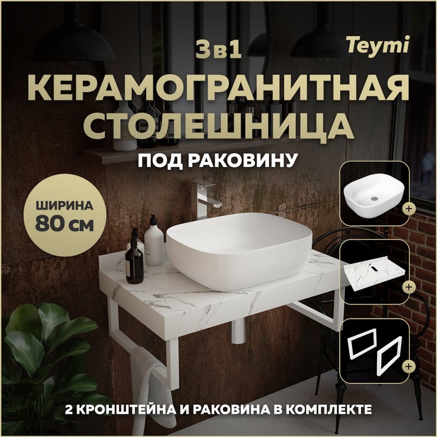 Столешница керамогранитная 80 см белый мрамор с раковиной Teymi Solli 50 кронштейны 2 шт. белые в комплекте F14009