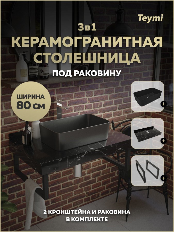 Столешница керамогранитная 80 см черный мрамор с раковиной Teymi Helmi Mini 48 черная матовая кронштейны 2 шт. черные в комплекте F15503
