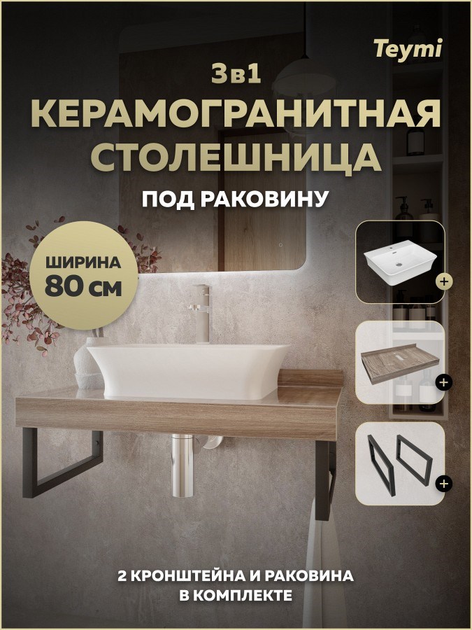 Столешница керамогранитная 80 см дуб кашмир с раковиной Teymi Aina 49 кронштейны 2 шт. черные в комплекте F15628