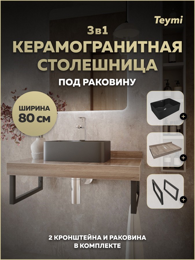 Столешница керамогранитная 80 см дуб кашмир с раковиной Teymi Helmi Mini 41 черная матовая кронштейны 2 шт. черные в комплекте F15647