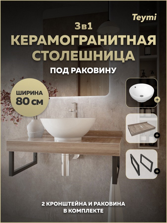Столешница керамогранитная 80 см дуб кашмир с раковиной Teymi Lina kuppi D40 кронштейны 2 шт. черные в комплекте F15623
