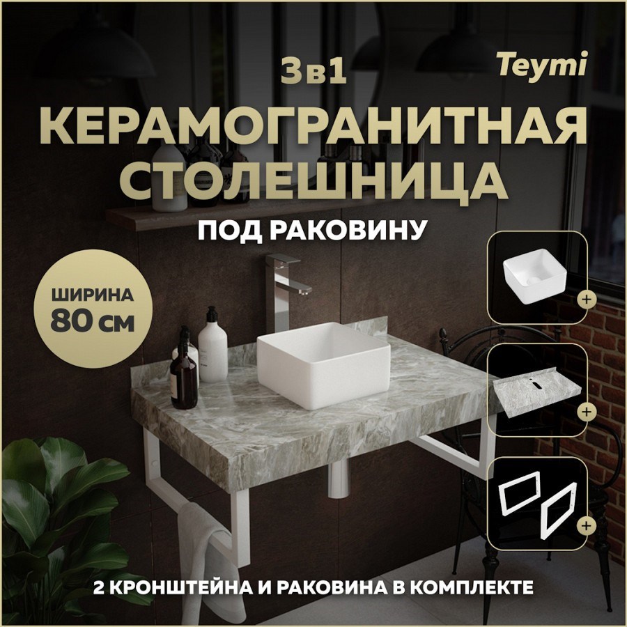Столешница керамогранитная 80 см серый мрамор с раковиной Teymi Helmi Mini 24 кронштейны 2 шт. белые в комплекте F14123