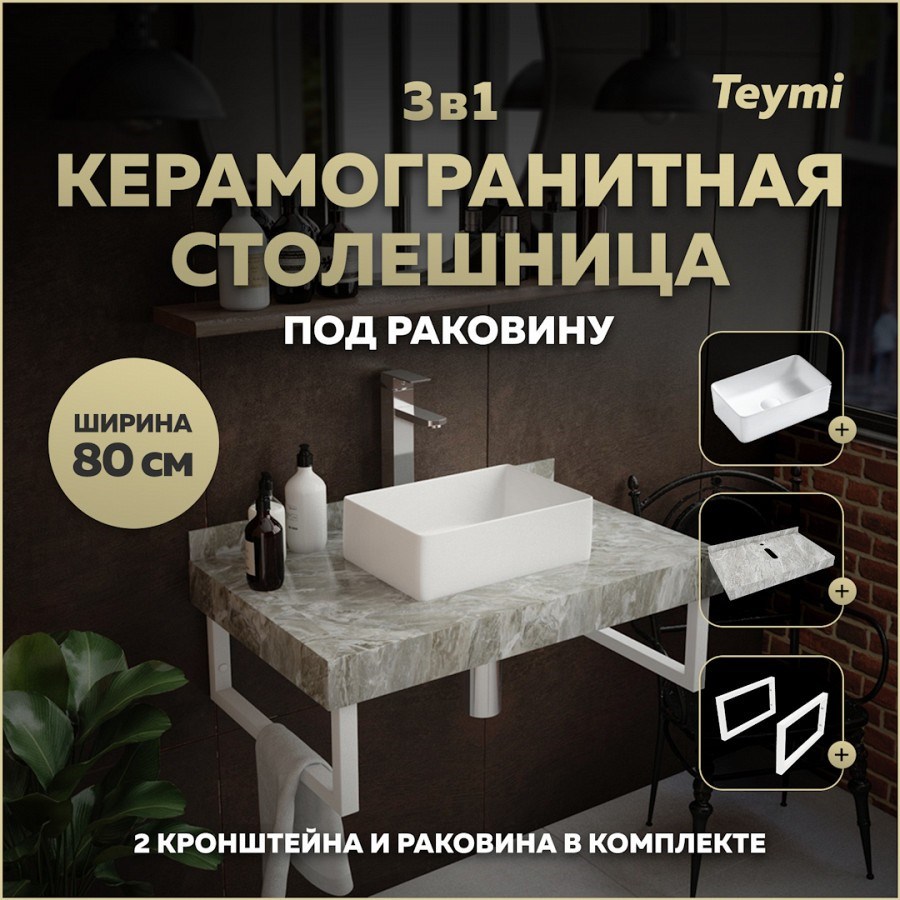 Столешница керамогранитная 80 см серый мрамор с раковиной Teymi Helmi Mini 38 кронштейны 2 шт. белые в комплекте F14124
