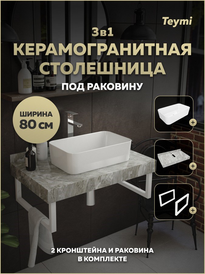 Столешница керамогранитная 80 см серый мрамор с раковиной Teymi Helmi Mini 48 кронштейны 2 шт. белые в комплекте F15373