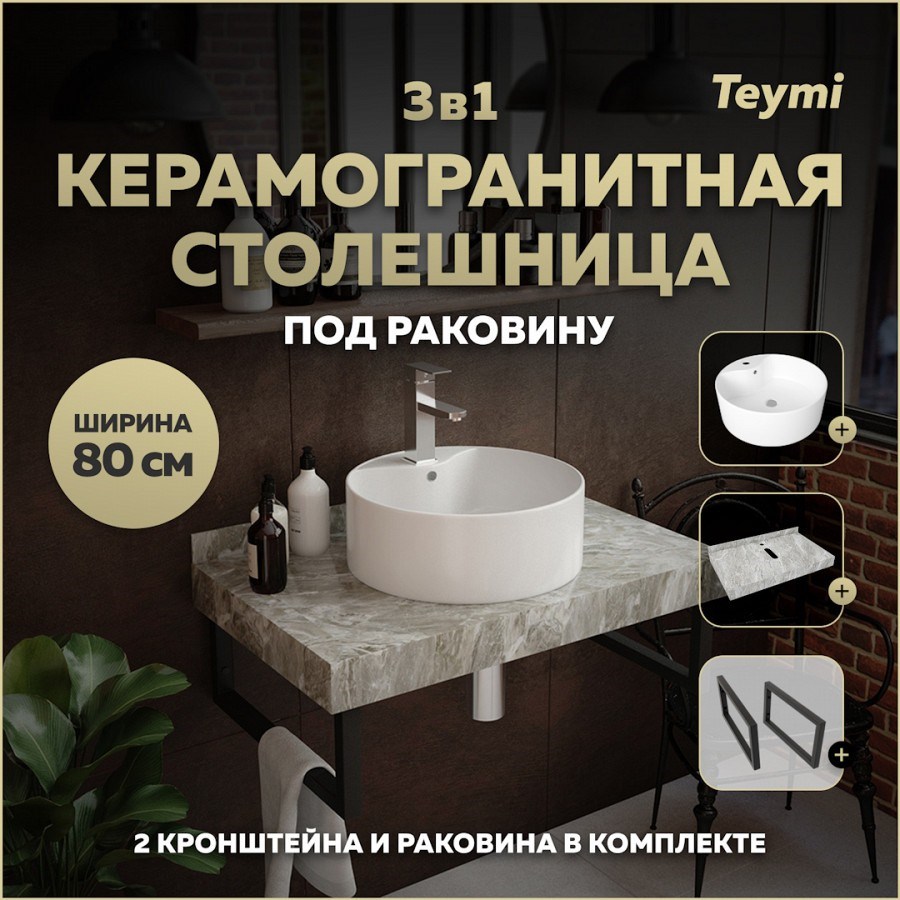 Столешница керамогранитная 80 см серый мрамор с раковиной Teymi Lina Pro D40 кронштейны 2 шт. черные в комплекте F14272