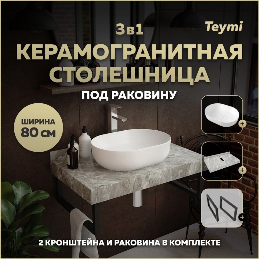 Столешница керамогранитная 80 см серый мрамор с раковиной Teymi Solli 48 кронштейны 2 шт. черные в комплекте F14269