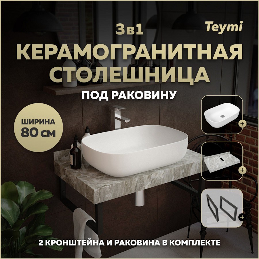 Столешница керамогранитная 80 см серый мрамор с раковиной Teymi Solli 60 кронштейны 2 шт. черные в комплекте F14250