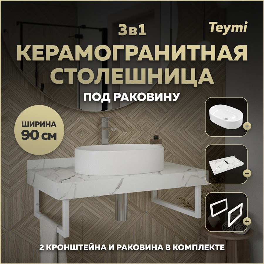 Столешница керамогранитная 90 см белый мрамор с раковиной Teymi Iva 52 кронштейны 2 шт. белые в комплекте F14029
