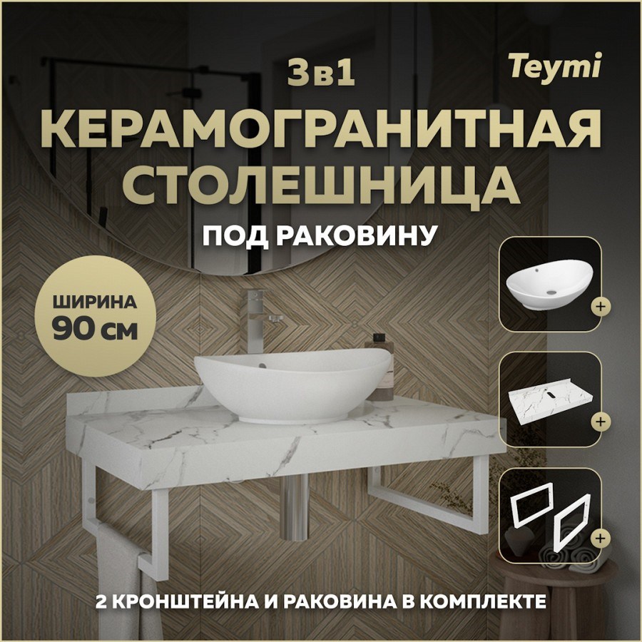 Столешница керамогранитная 90 см белый мрамор с раковиной Teymi Lori 60 кронштейны 2 шт. белые в комплекте F14033