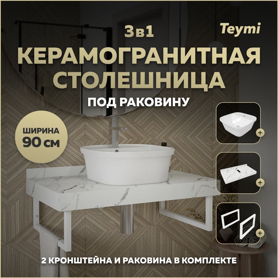 Столешница керамогранитная 90 см белый мрамор с раковиной Teymi Solli 43 кронштейны 2 шт. белые в комплекте F14039
