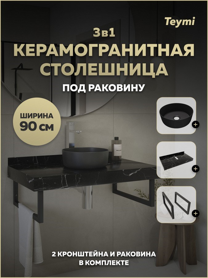 Столешница керамогранитная 90 см черный мрамор с раковиной Teymi Lina D31 черная матовая кронштейны 2 шт. черные в комплекте F15544