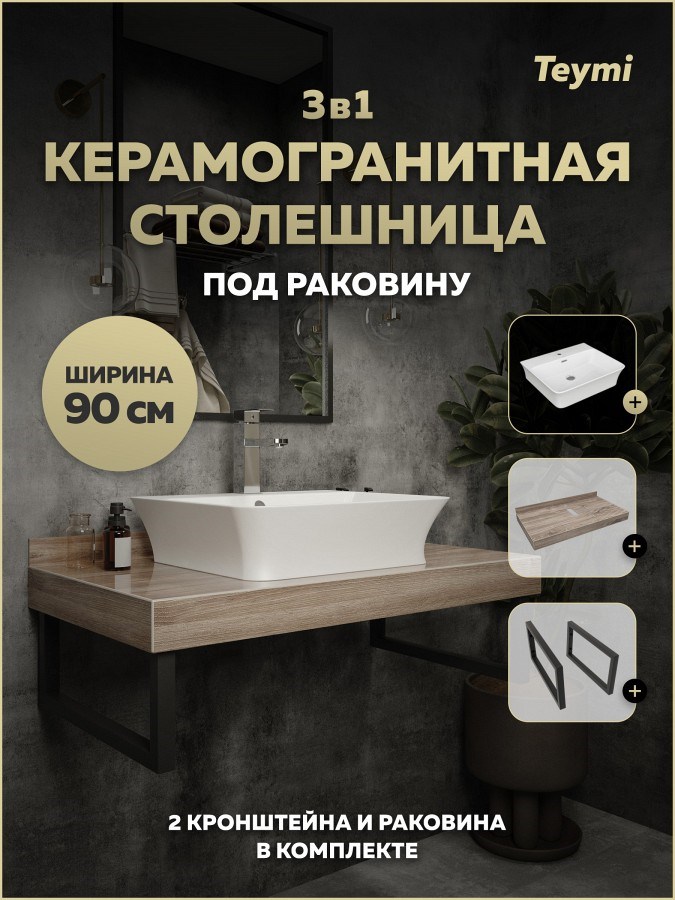 Столешница керамогранитная 90 см дуб кашмир с раковиной Teymi Aina 49 кронштейны 2 шт. черные в комплекте F15663