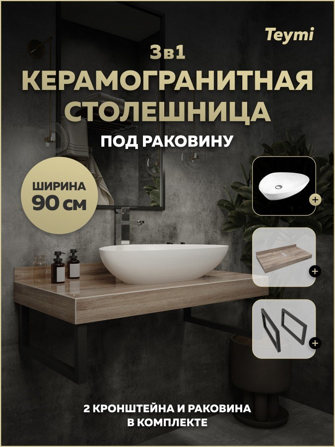 Столешница керамогранитная 90 см дуб кашмир с раковиной Teymi Ellie 60 кронштейны 2 шт. черные в комплекте F15655