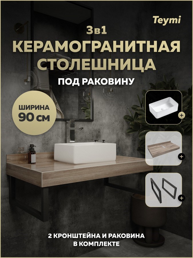 Столешница керамогранитная 90 см дуб кашмир с раковиной Teymi Helmi Mini 38 кронштейны 2 шт. черные в комплекте F15652