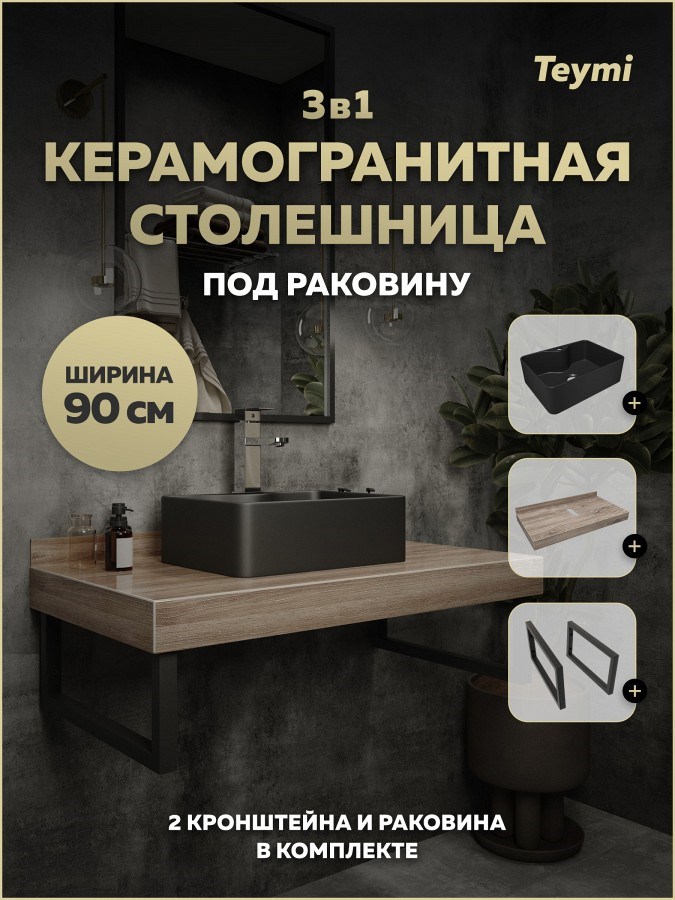 Столешница керамогранитная 90 см дуб кашмир с раковиной Teymi Helmi Mini 41 черная матовая кронштейны 2 шт. черные в комплекте F15682