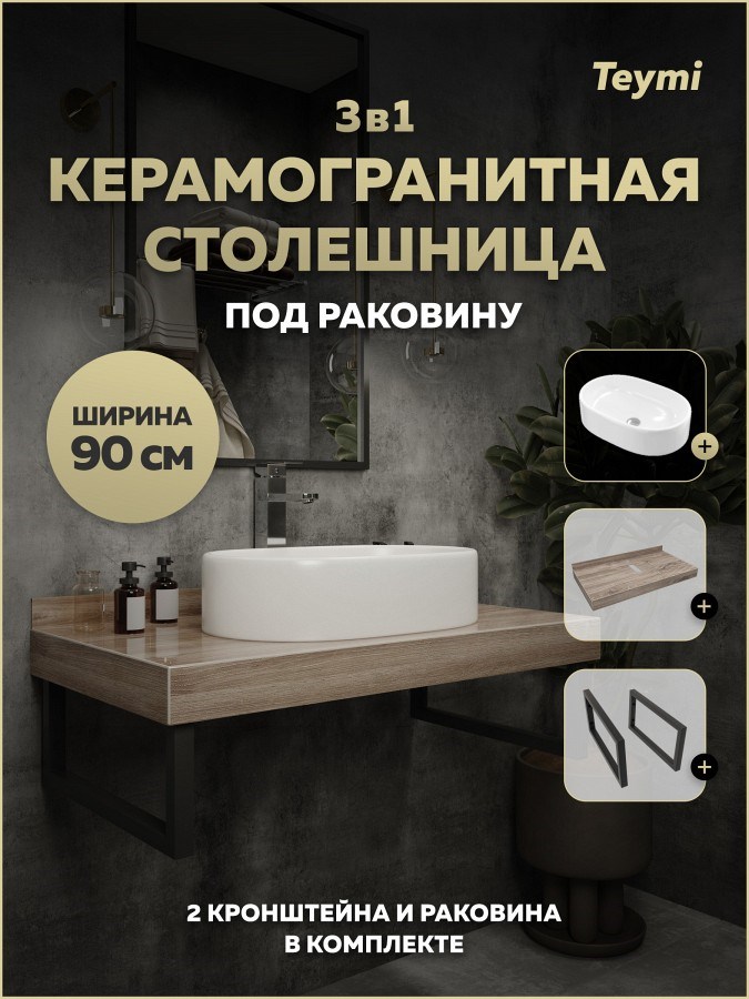 Столешница керамогранитная 90 см дуб кашмир с раковиной Teymi Iva 52 кронштейны 2 шт. черные в комплекте F15657
