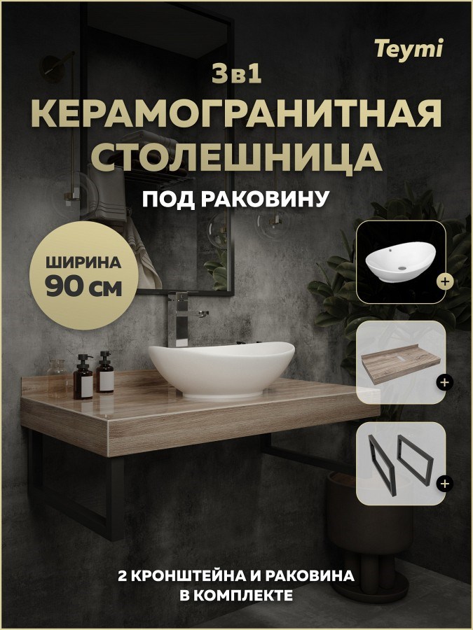 Столешница керамогранитная 90 см дуб кашмир с раковиной Teymi Lori 60 кронштейны 2 шт. черные в комплекте F15661