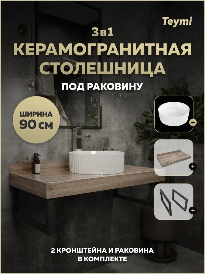 Столешница керамогранитная 90 см дуб кашмир с раковиной Teymi Martta D36 кронштейны 2 шт. черные в комплекте F15681