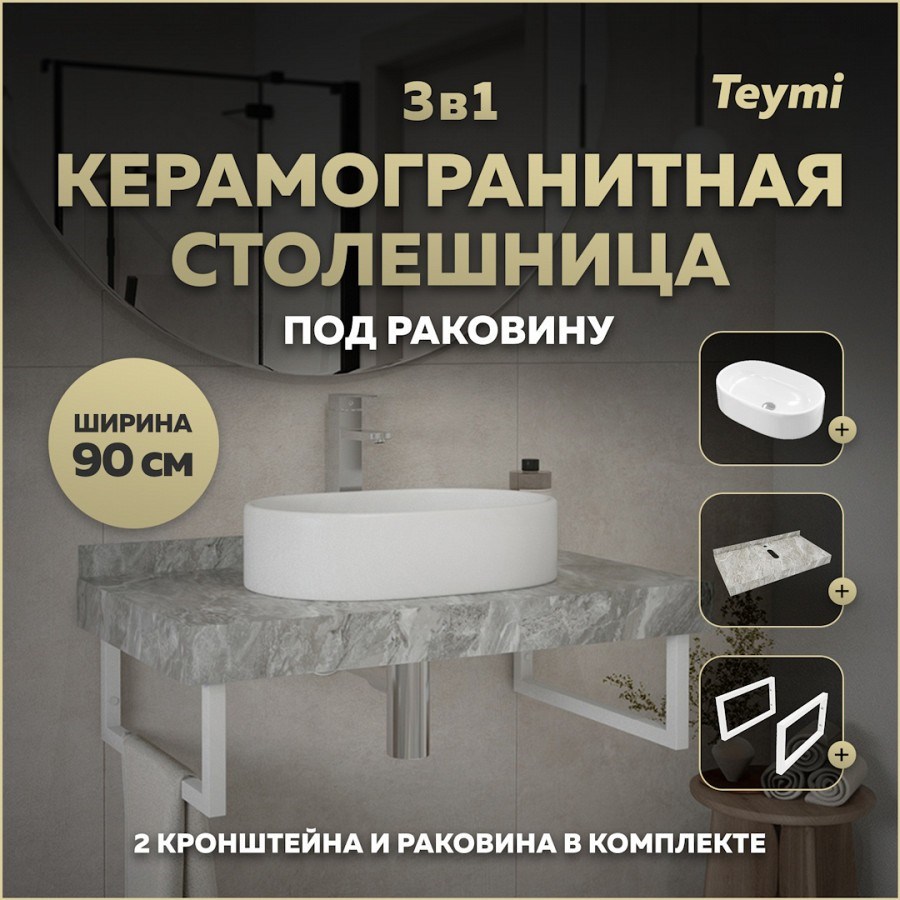 Столешница керамогранитная 90 см серый мрамор с раковиной Teymi Iva 52 кронштейны 2 шт. белые в комплекте F14154