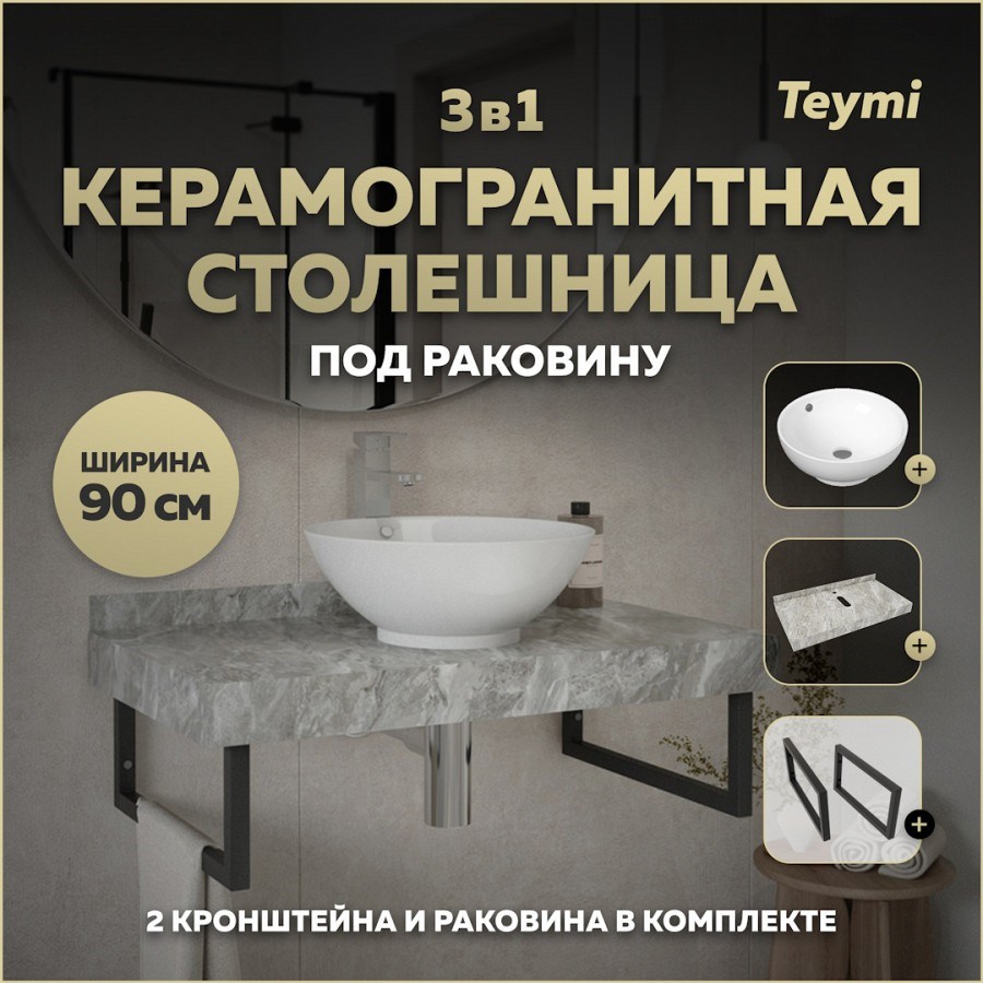 Столешница керамогранитная 90 см серый мрамор с раковиной Teymi Lina kuppi D40 кронштейны 2 шт. черные в комплекте F14280