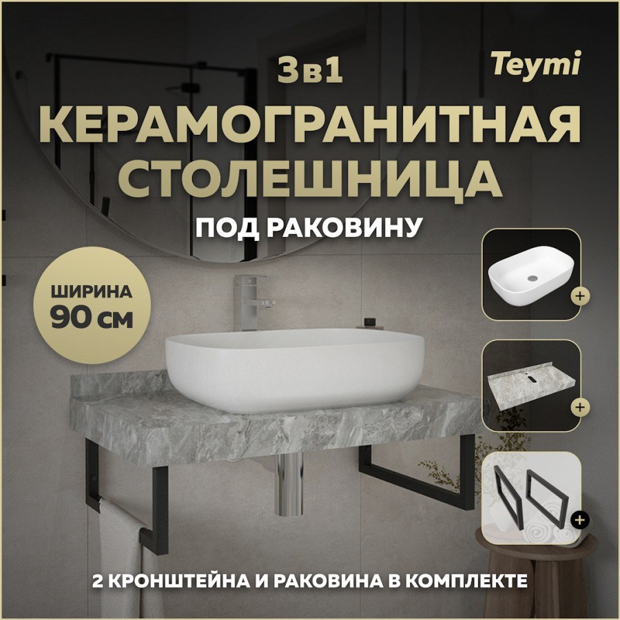 Столешница керамогранитная 90 см серый мрамор с раковиной Teymi Solli 60 кронштейны 2 шт. черные в комплекте F14275
