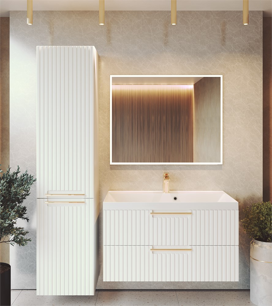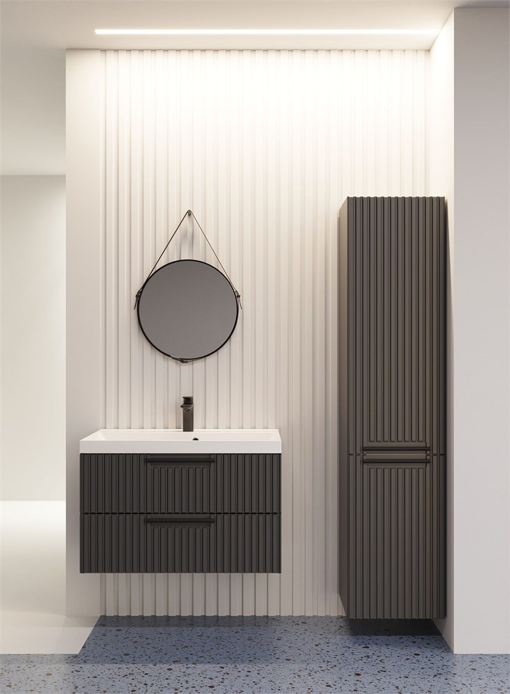 Глубокая вертикальная фрезеровка фасадов придает уникальность тумбе и создает объем, что является очень интересным дизайнерским решением.