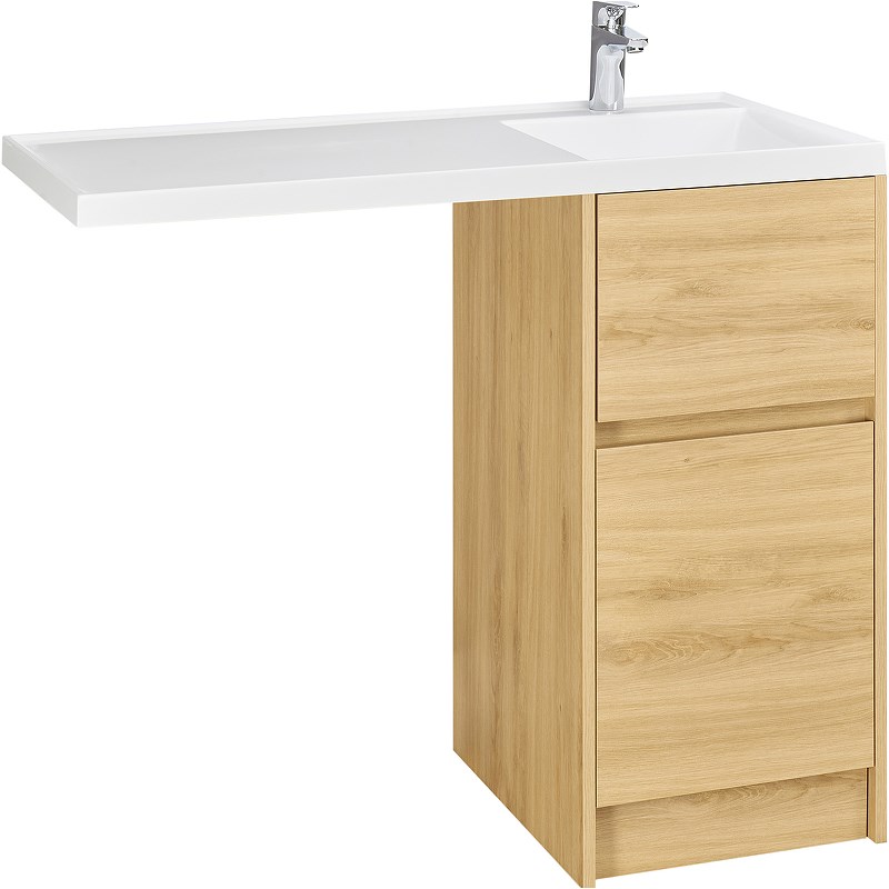 Тумба Лондри под стиральную машину выполнена из влагостойкой ламинированной плиты в древесной отделке. Тумбы комплектуются фасадами как с такой же древесной текстурой, так и в универсальном белом глянцевом цвете – это позволяет выбрать модель тумбы в соответствии с личными предпочтениями, создав наиболее удачное решение для конкретного интерьера ванной комнаты. Более того, при желании в одной тумбе можно совместить корпус и фасады в двух разных по оттенку древесных декорах. Верхний ящик открывается с помощью системы push-to-open, а нижний - за фасад с помощью удобного выпила под углом. Тумба установлена на регулируемые опоры, которые находятся за цоколем. Тумба комплектуется раковиной Лондри 105 из прочного литого мрамора (Приобретается отдельно!). Широкое крыло раковины обеспечивает ванную комнату дополнительным функциональным пространством. Дополнительно к тумбе можно приобрести шкаф-колонну Лондри и зеркальный шкаф Лондри 100.