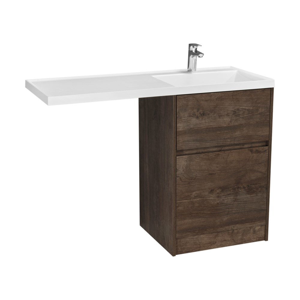 Тумба Лондри под стиральную машину выполнена из влагостойкой ламинированной плиты в древесной отделке. Корпус тумбы и фасад приобретаются отдельно. Тумбы комплектуются фасадами как с такой же древесной текстурой, так и в универсальном белом глянцевом цвете – это позволяет выбрать модель тумбы в соответствии с личными предпочтениями, создав наиболее удачное решение для конкретного интерьера ванной комнаты. Верхний ящик открывается с помощью системы push-to-open, а нижний - за фасад с помощью удобного выпила под углом. Ящики выдерживают нагрузку до 25 кг. Тумба установлена на регулируемые опоры, которые находятся за цоколем. Тумба комплектуется раковиной Лондри 120 из прочного литого мрамора, который устойчив к воздействию химических средств. Широкое крыло раковины обеспечивает ванную комнату дополнительным функциональным пространством. Дополнительно к тумбе можно приобрести шкаф-колонну Лондри и зеркальный шкаф Лондри 120.