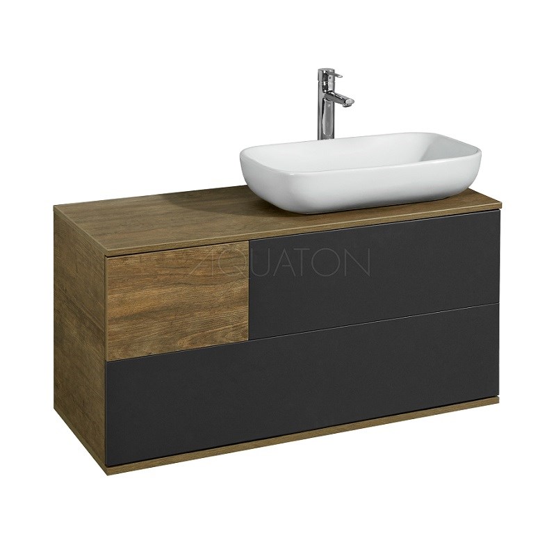 Текстуры на тумбе Терра 105 расположены ассиметрично: столешница, корпус и вставка на верхнем ящике - влагостойкое ДСП с текстурой дуб кантри, фасады ящиков - матовая серая пленка антрацит.