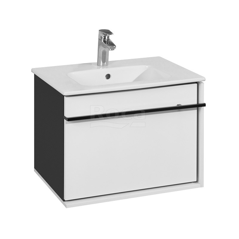 Четкая геометрия линий, сдержанность и широкий функционал – три определения, которые лучше всего описывают коллекцию Aneto. Фасад модуля Aneto размера 600 мм выполнен из MDF, окрашенной в белоснежный глянец, а корпус и левая боковая стенка – из влагостойкой ламинированной плиты в черном цвете. За фасадом находится небольшой внутренний ящик, открывающийся с помощью системы push-to-open и идеально подходящий для хранения небольших мелочей. Вместительный внешний ящик позволит разместить более крупные предметы. Тонкая и изящная ручка в черном матовом цвете подчеркивает графичность дизайна коллекции и может использоваться как полотенцедержатель. Модуль комплектуется керамической раковиной Roca Victoria-N.