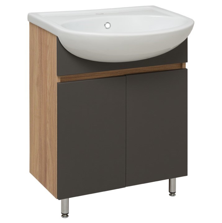 Тумба с раковиной RUNO ЛАДА - модное и оригинальное решение для бюджетного оснащения ванной комнаты. Тумба под раковину ЛАДА (напольная) выполнена в двух цветах - классическом белом и в стильном цвете - графит/серый дуб . Тумба в ванную имеет две распашные дверцы и одну внутреннюю полку. В комплекте идут петли со встроенным доводчиком, 2 хромированные и 2 пластиковые ножки. Тумба для ванной комплектуется керамической раковиной Уют" (610*470 мм). Раковина имеет глубину 21 см. Раковина имеет глубину 18 см. Мебель для ванной RUNO - красота и практичность в мелочах!"
