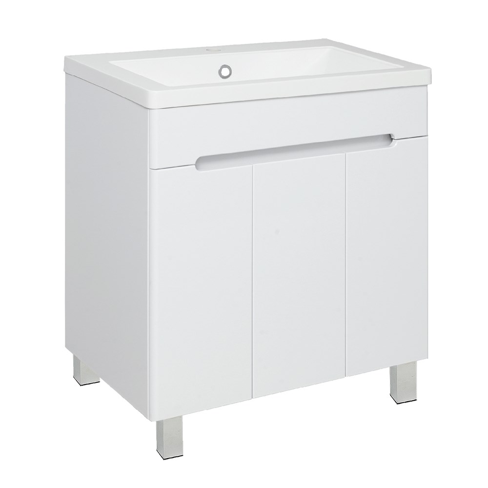 Тумба под умывальник напольная с тремя распашными дверками. Петли со встроенным доводчиком, ножки хром - 2шт, ножки пластик - 2шт.