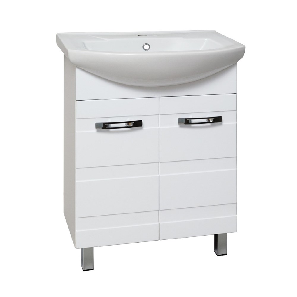 Тумба под умывальник напольная с двумя распашными фасадами и одной внутренней полкой. Петли со встроенным доводчиком, ручки - 2шт, ножки хром - 2шт, ножки пластик -2шт.