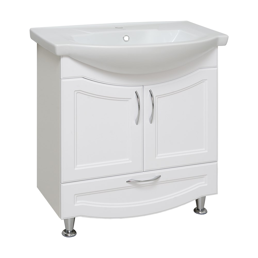 Тумба под умывальник напольная с двумя распашными дверками и нижним выдвижным ящиком. За фасадами - одна встроенная полка. Петли со встроенным доводчиком, ящик - на шариковых направляющих полного выдвижения, ручки - 3шт, ножки хром - 2шт, ножки пластик -2шт.
