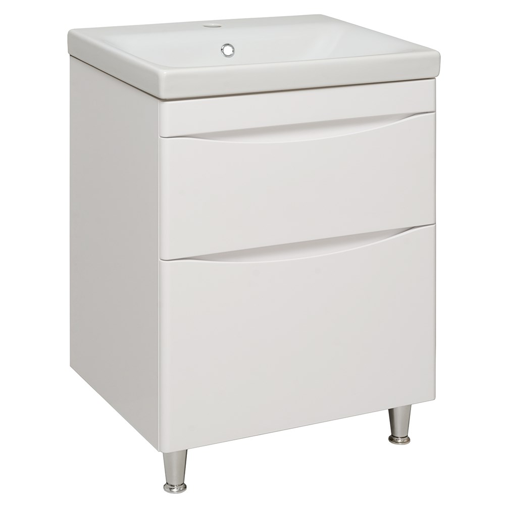 Тумба с раковиной для ванной комнаты RUNO АФИНА - безупречное сочетание модных тенденций с классическим оформлением ванной комнаты. Тумба под раковину в ванную АФИНА имеет два выдвижных ящика на шариковых направляющих, оснащенных системой плавного закрывания. Цвет фасада универсальный - белый, идеально впишется в любой интерьер ванной комнаты. В комплекте идут 2 хромированные и 2 пластиковые ножки. Тумба для ванной комнаты комплектуется накладной керамической раковиной Moduo" (605х460 мм). Раковина имеет глубину 17,5 см. Мебель для ванной RUNO - красота и практичность в мелочах!