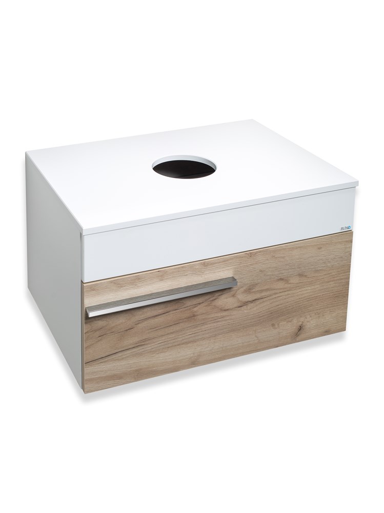 Тумба под раковину в ванную RUNO ВУДЛАЙН (подвесная) - выполнена в ультрасовременном дизайне в цвете крафтовый дуб. Тумба в ванную оснащена выдвижным ящиком на шариковых направляющих. Тумба под раковину ВУДЛАЙН гармонично впишется в любой интерьер ванной комнаты. В комплект входят: 1 ручка, навесы для крепления к стене. К тумбе для ванной комнаты подходят накладные керамические раковины: Infinity 60 с чашей прямоугольной формы (600х370 мм), глубиной 12 см; Moduo 50 SQUARE с чашей прямоугольной формы (500х360 мм), глубиной 15 см; Moduo 55 LEAF - асимметричная раковина, которую можно установить любой стороной, дизайнерское решение для нестандартных интерьеров (565х365 мм), глубиной 15 см; Гамма 56 - c глубокой чашей и высокими бортиками, которые отражают современные тренды в дизайне. (560х370 мм), глубиной 18 см. Мебель для ванной RUNO - красота и практичность в мелочах!