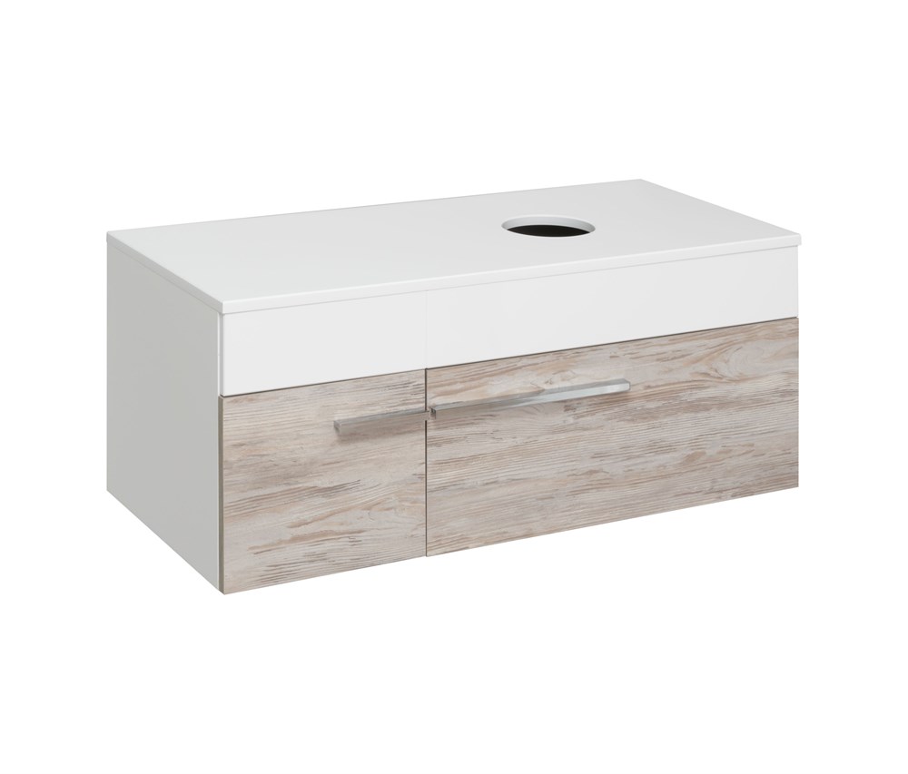 Тумба подвесная под умывальник с выдвижным ящиком. Благодаря универсальному отверстию на столешнице тумба может комплектоваться различными вариантами накладных раковин: модель «Caspia» 60 TM Cersanit с вместительной чашей овальной или квадратной формы или раковина «Гамма» 56 ТМ Kirovit c глубокой чашей и высокими бортиками, которые отражают современные тренды в дизайне. Ящик на шариковых направляющих, оснащенных системой плавного закрывания.
