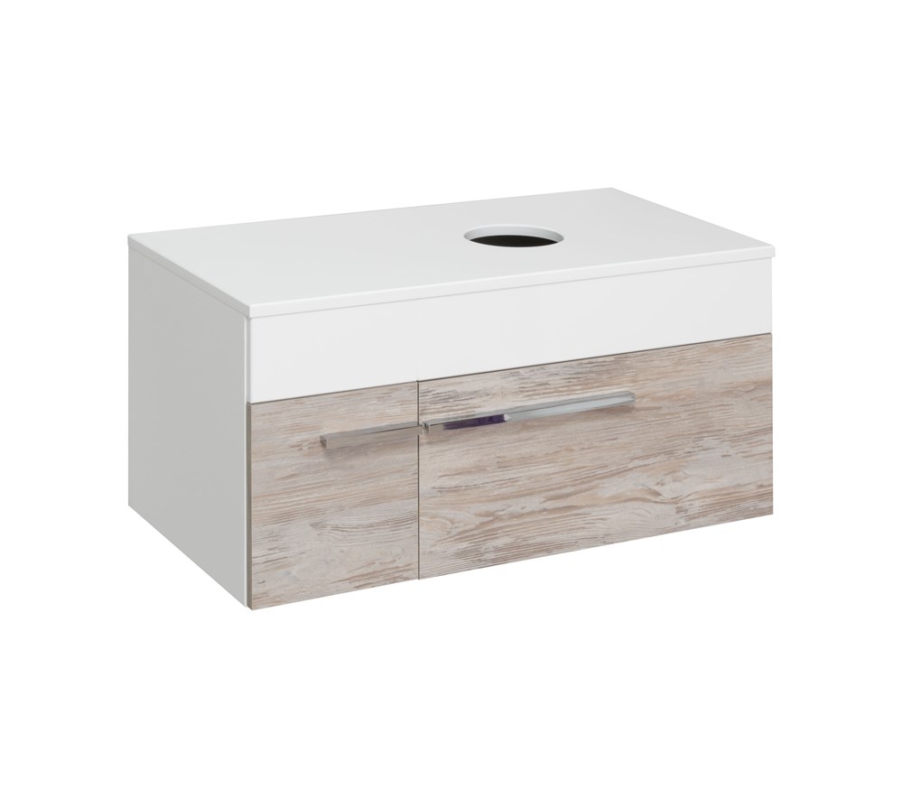 Тумба подвесная под умывальник с одной распашной дверкой и выдвижным ящиком справа. Благодаря универсальному отверстию на столешнице тумба может комплектоваться различными вариантами накладных раковин: модель «Caspia» 60 TM Cersanit с вместительной чашей овальной или квадратной формы или раковина «Гамма» 56 ТМ Kirovit c глубокой чашей и высокими бортиками, которые отражают современные тренды в дизайне. Ящик на шариковых направляющих, оснащенных системой плавного закрывания. Петли со встроенным доводчиком.