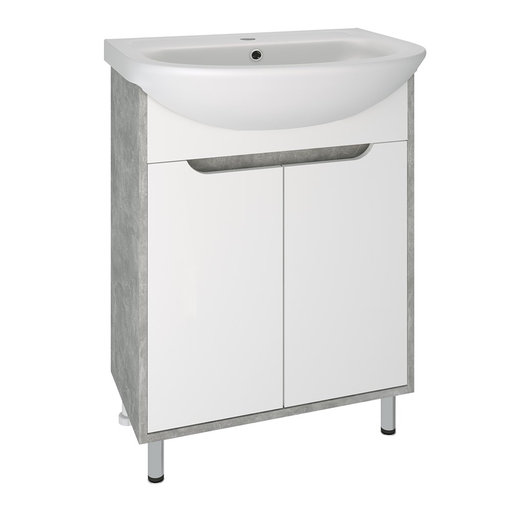 Тумба с раковиной RUNO ЭКО - превосходное решение для современного оснащения ванной комнаты. Тумба под раковину ЭКО (напольная) это стильное сочетание текстуры серого необработанного бетона на корпусе с белыми фасадами из ДСП. Тумба в ванную имеет две распашные дверцы и одну внутреннюю полку. В комплекте идут петли, 2 хромированные и 2 пластиковые ножки. Тумба для ванной комплектуется керамической раковиной УЮТ" (610*470 мм). Раковина имеет глубину 21 см. Мебель для ванной RUNO - красота и практичность в мелочах!"