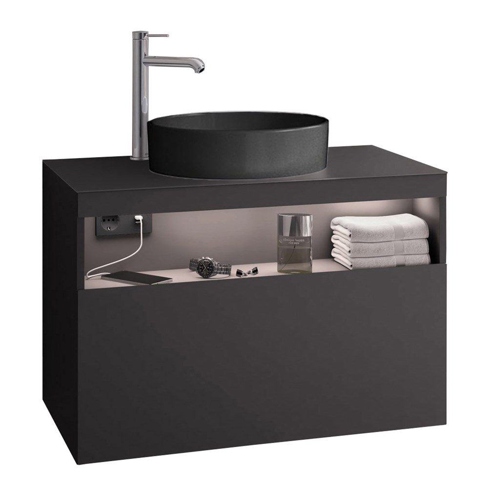 Подходит к керамическому умывальнику арт. 32880, 1 выдвижной фронтальный ящик с доводчиком, oтверстие под смеситель слева, 35 мм, вкл. пластиковый сифон 1 1/4 x 32.