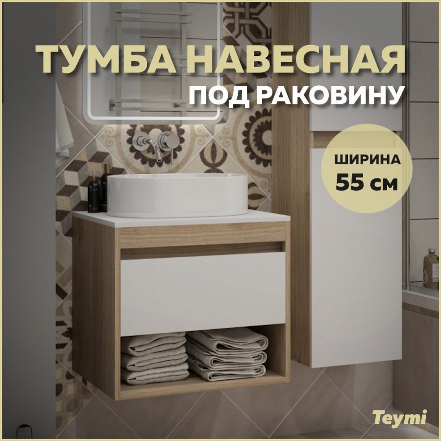 Тумба подвесная для ванной 55 см Teymi Ritta корпус дуб фасад белый T60519