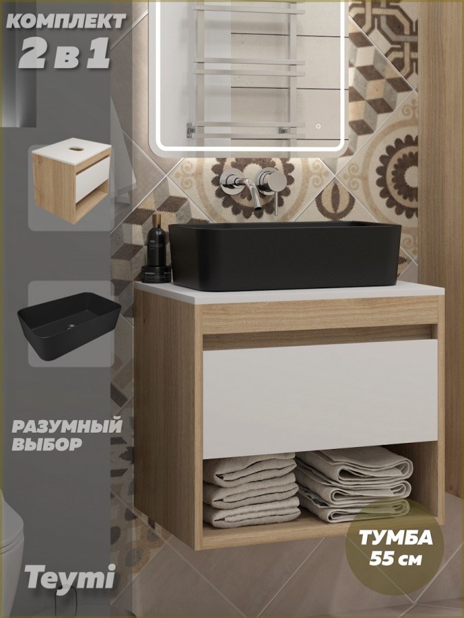 Тумба подвесная с раковиной для ванной 55 см Teymi Ritta корпус дуб фасад белый раковина Helmi Mini 48 черная матовая F15093
