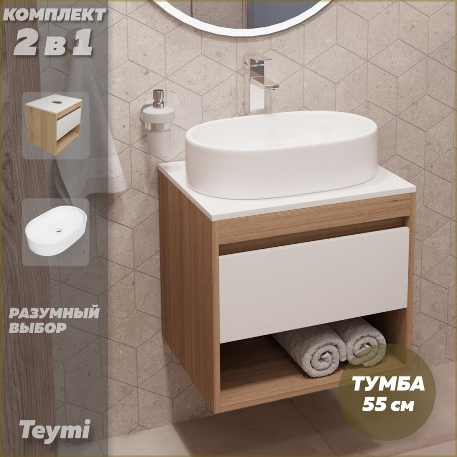 Тумба подвесная с раковиной для ванной 55 см Teymi Ritta корпус дуб фасад белый раковина Iva 52 F03287