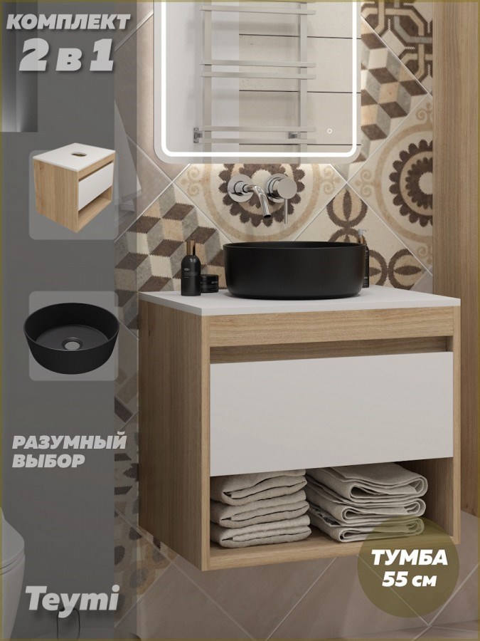 Тумба подвесная с раковиной для ванной 55 см Teymi Ritta корпус дуб фасад белый раковина Lina D31 черная матовая F15109