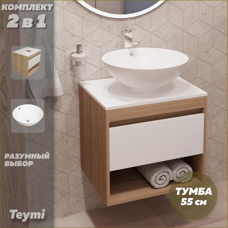 Тумба подвесная с раковиной для ванной 55 см Teymi Ritta корпус дуб фасад белый раковина Lina kuppi D40 F03288